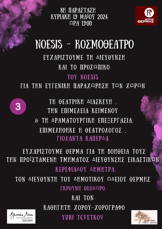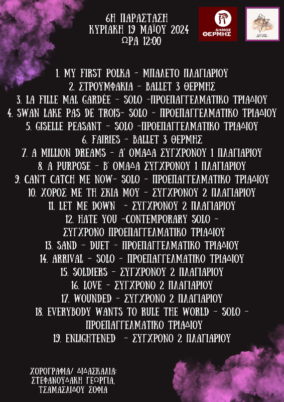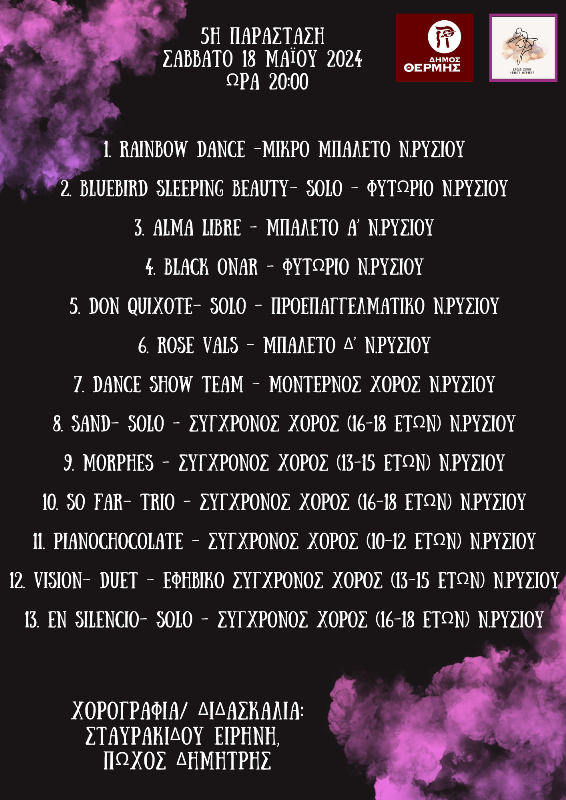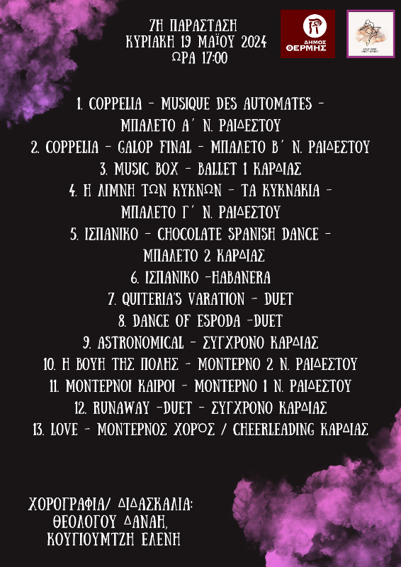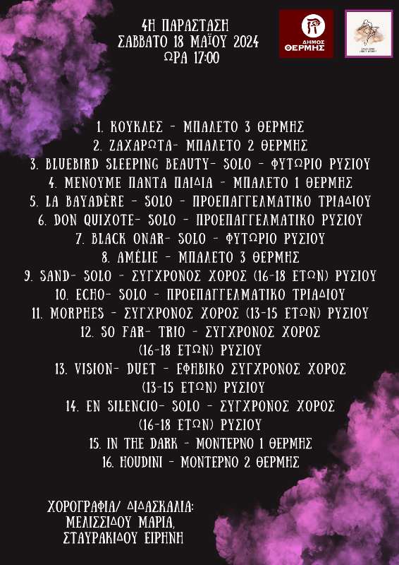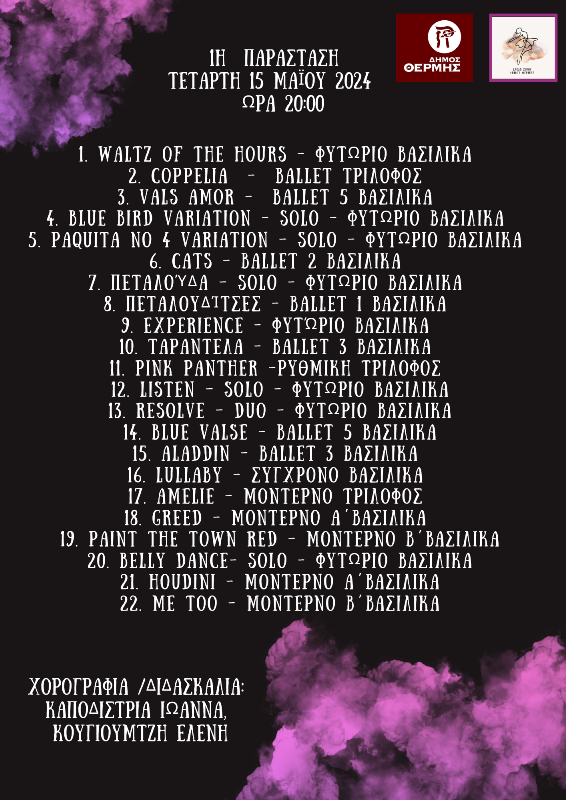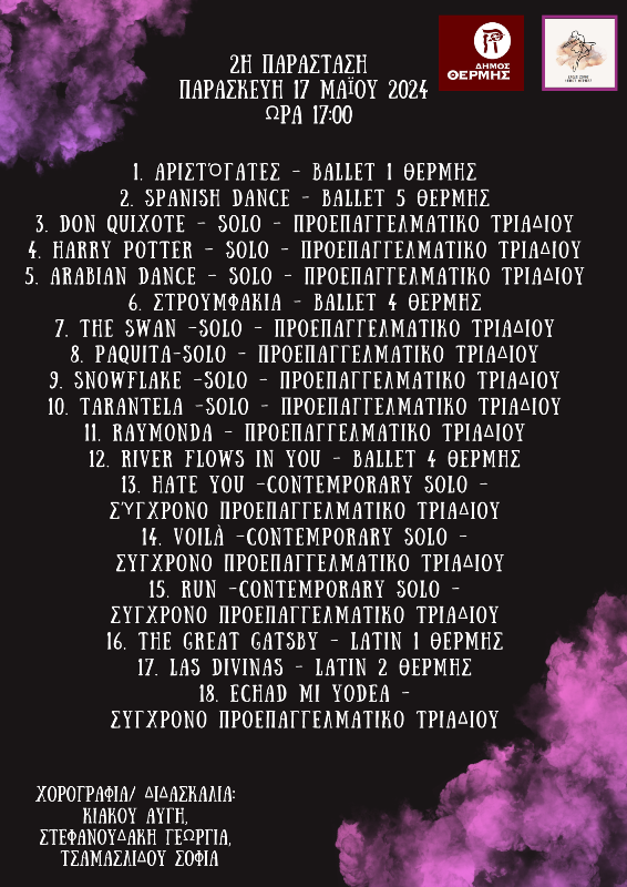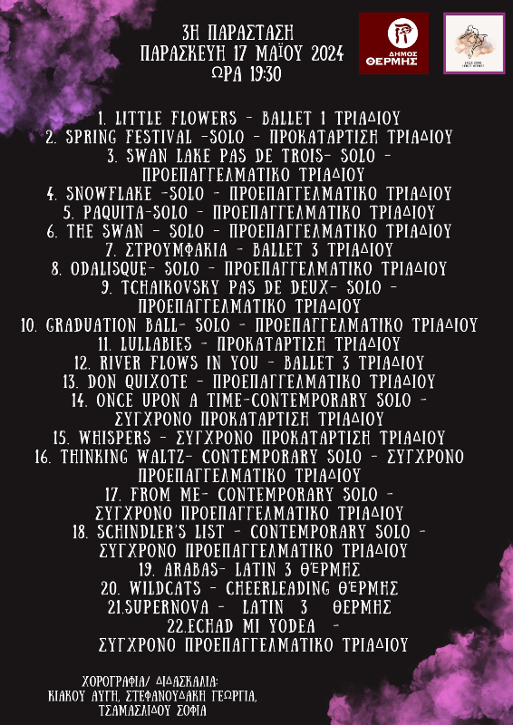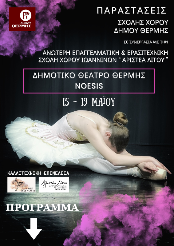 Φέτος με ιδιαίτερη χαρά , η Σχολή Χορού Δήμου Θέρμης συνεργάζεται στενά με την Ανώτερη ερασιτεχνική και επαγγελματική σχολή χορού Ιωαννίνων “Αριστέα Λίτου” για να σας παρουσιάσουν τις τελικές παραστάσεις χορού των μαθητών – σπουδαστών μας!